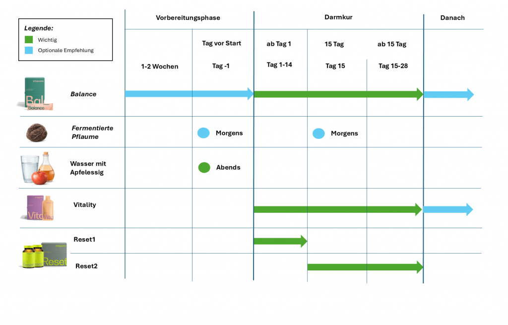 👉 Entscheidend ist immer die persönliche Einnahmeempfehlung, die du im Rahmen der Darmkur von deinem Berater erhältst und die wir gemeinsam abgestimmt haben. Diese findest du in dieser Anleitung.